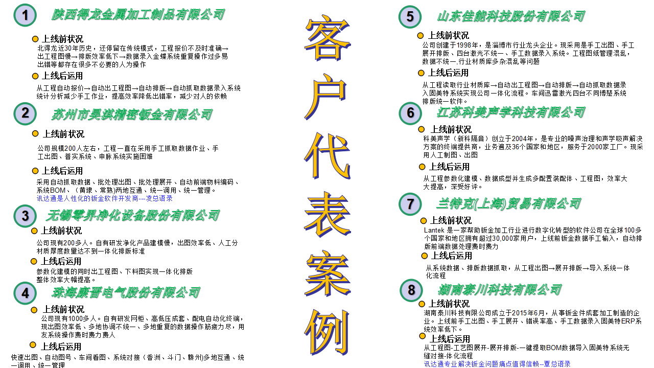 讯达通科技凭借独到的理念、优秀的团队、丰富的钣金研发经验,以及完善的服务体系,将自身专业的钣金软件优势同客户的实际情况与需求相结合,帮助客户的在商业钣金市场环境中保持竞争优势,取得非凡成就。